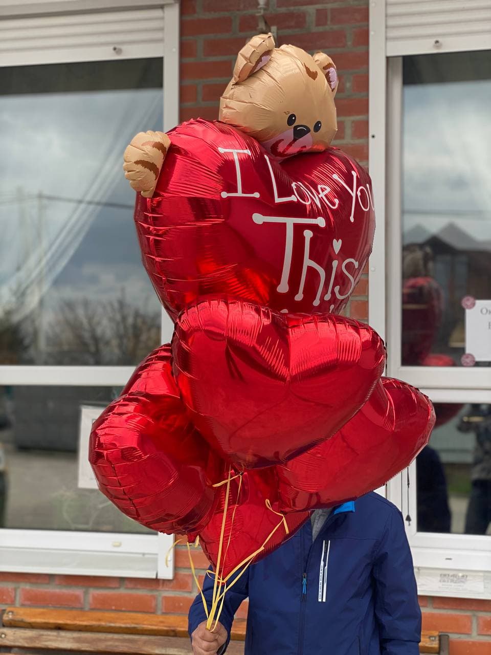 Набір: Мишка тримає серце та 4 червоні фольговані серця