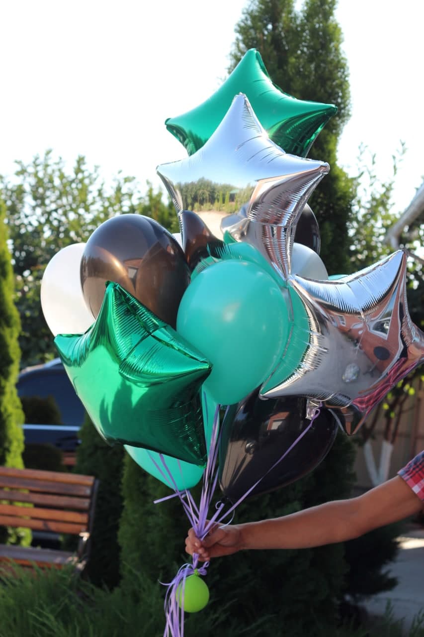 Набір: Фольга зірка 4 шт (зелена та срібло), латекс кулька15 шт (зелений, чорний та білий) - Із обробкою Hi-float