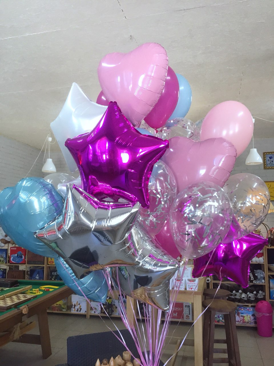 Набір: фольга зірка 5 шт (сірий, фіолетовий та білий), серця фольга 5 (рожевий та блакитний), конфеті 5 шт, латекс кульки 5 шт (рожевий та блакитний) - Із обробкою Hi-float