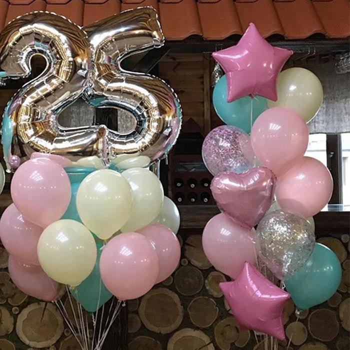 Набір цифри серебро(1 метр) 2 шт; звичайні кульки бірюзові, білі та рожеві 21 шт; конфеті 2 шт; фольга зірка рожева 3 шт - Із обробкою Hi-float