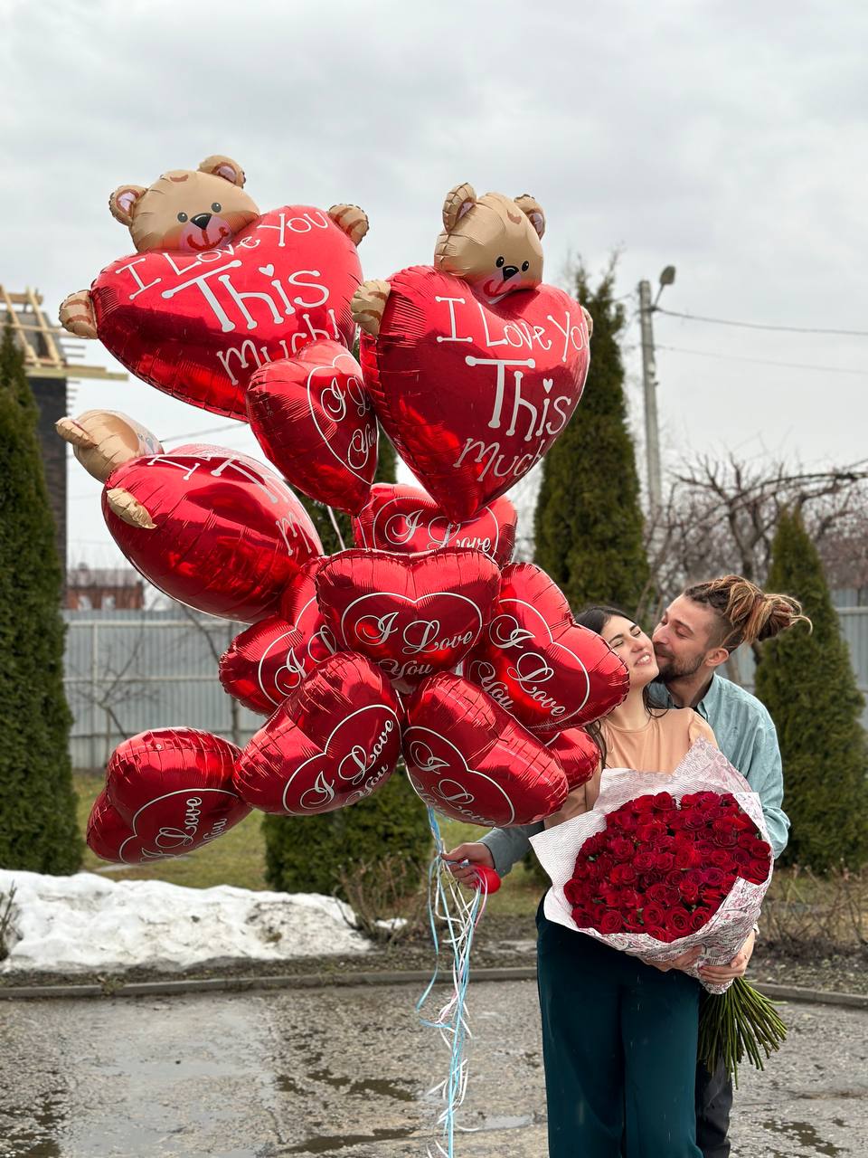 💖 WOW-набір: 101 червона троянда (висока), 10 фольгованих сердець, 3 великі серця та ведмедик 💖